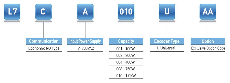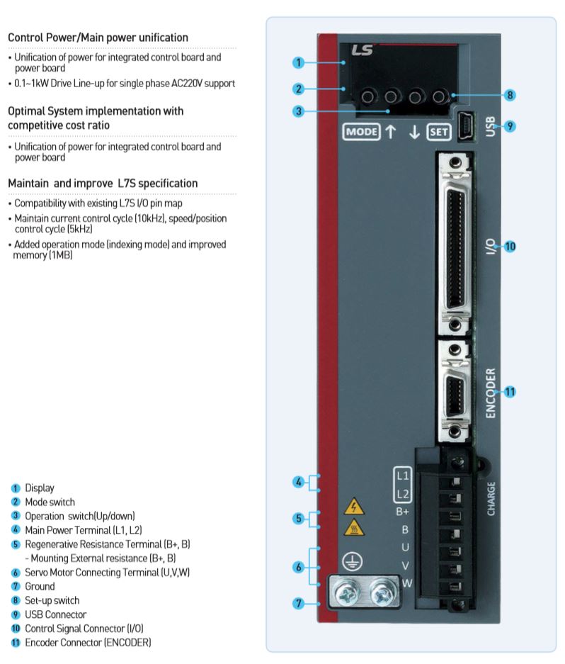 L7C je servo pogon iz L7 serije proizvajalca LS Electric, ki omogoča priklope servo motorjev moči od 0,1 kW do 1 kW v vezavi 3x230V.