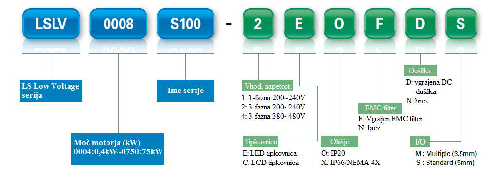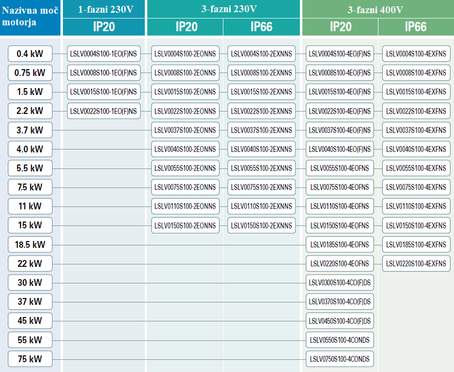 *Frekvenčni pretvorniki S100 v IP66 zaščiti ne omogočajo dual rating delovanja.